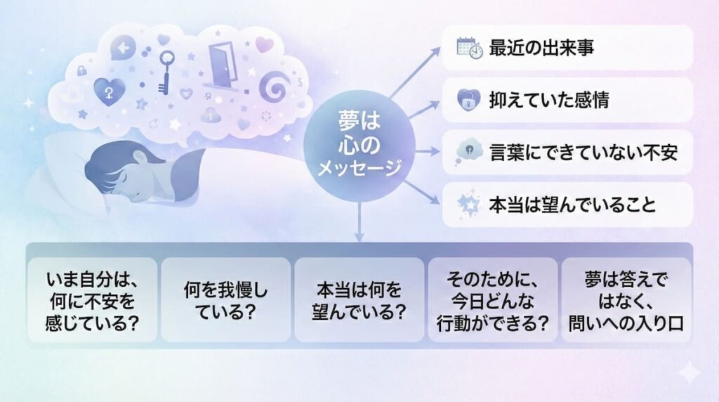 だいたいは「気づいてほしいテーマ」が未処理のままだからです。夢は気づきを促しますが、現実の行動が変わらないと繰り返し出やすいです。5ステップの最後、**“1アクション”**が効きます。
